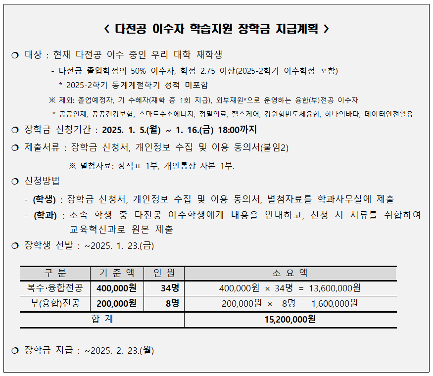 fnctId=bbs,fnctNo=567 [학부] 2025학년도 다전공 이수자 학습지원 장학금 지급 계획 알림 작성일 2026.01.02 작성자 박혜진 조회수 326 첨부파일 (붙임1) 창의융합형 인재 양성을 위한 다전공 학습지원 장학금 지급 계획.hwp (붙임3) 다전공 이수자 학습지원 장학금 신청서 및 개인정보 동의서.hwp (붙임2) 융합전공 이수자 학습지원 장학금 지급계획.hwp